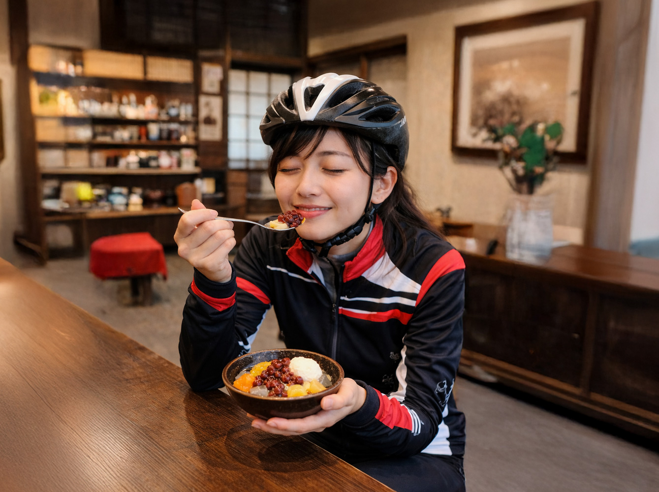 注文したのは、彩り鮮やかなあんみつ。運ばれてきた器を前に、まずは一口あんこを口に運ぶ。その瞬間、脳を突き抜けるような衝撃が走った。これほどまでに甘みが愛おしく感じられたことがあっただろうか。ライドでじわじわと削られた身体の隅々に、濃密なあんこの甘さが濁流のように染みわたっていく。
