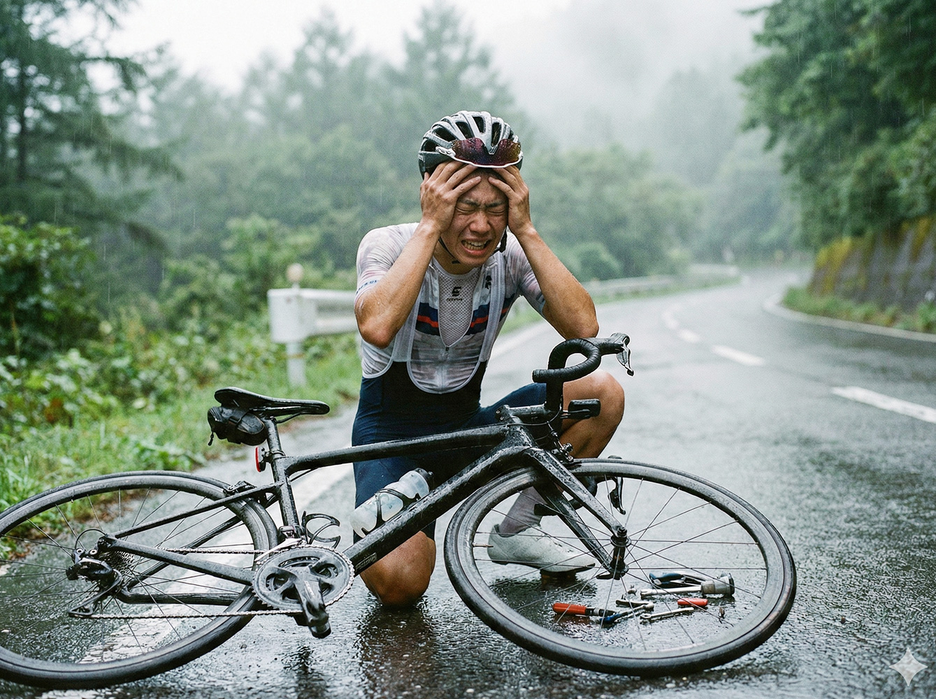全ての準備を完璧に整えたはずが、唯一見落とした項目が致命傷になるこの現象。「よりによって今日かよ…」と天を仰ぐのは、ローディーの誰もが一度は経験するお約束の展開です。