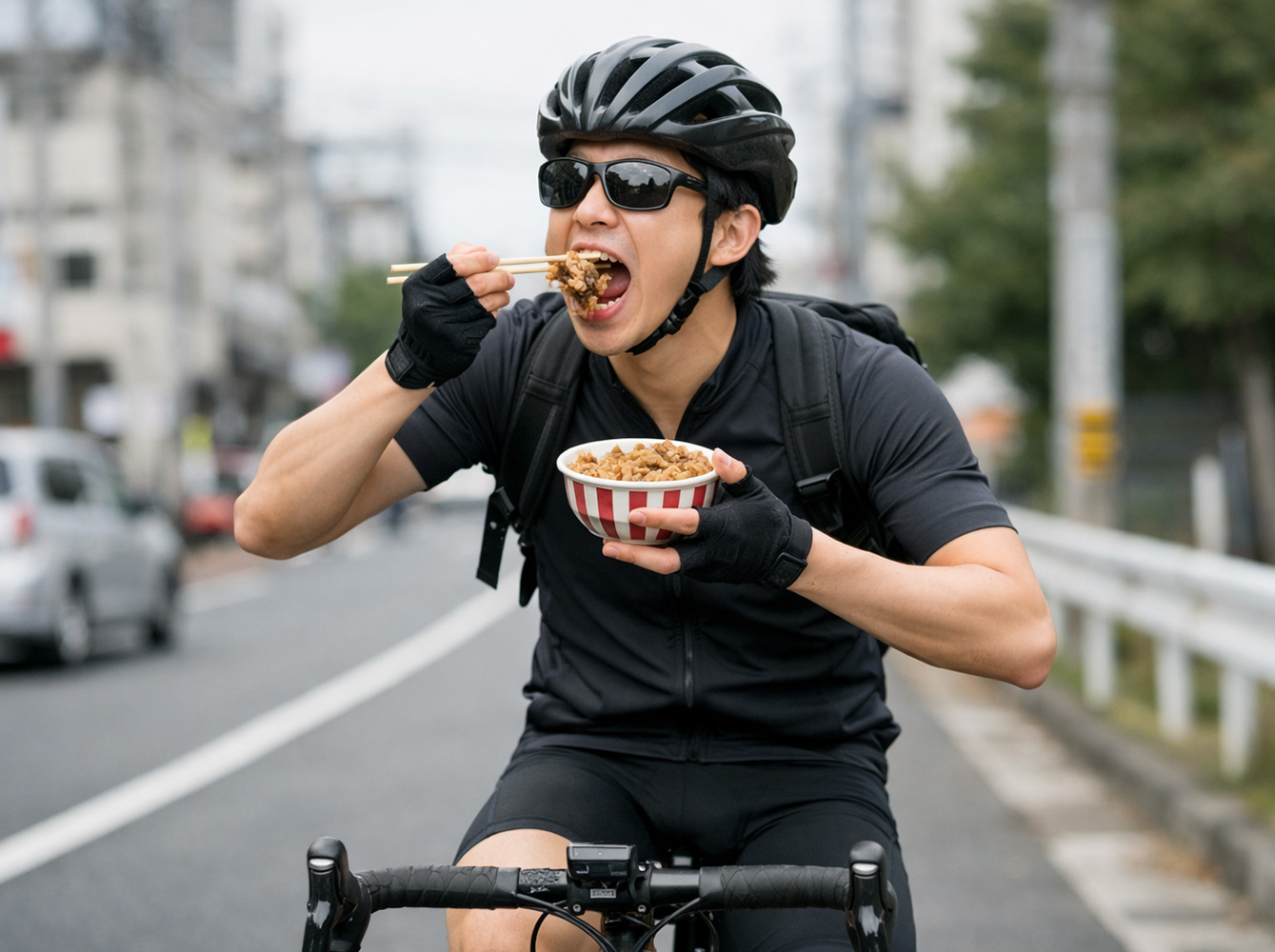 つまり、ロングライドを走り抜くためには、走行前からの計画的なエネルギー蓄積に加え、走行中も効率的な補給食を小まめに摂取し続ける必要があります。もしも牛丼だけで全てのエネルギーを賄おうとすれば、補給ポイントごとに特盛を平らげるような、まさに食の限界に挑む地獄の様相を呈することになるでしょう。