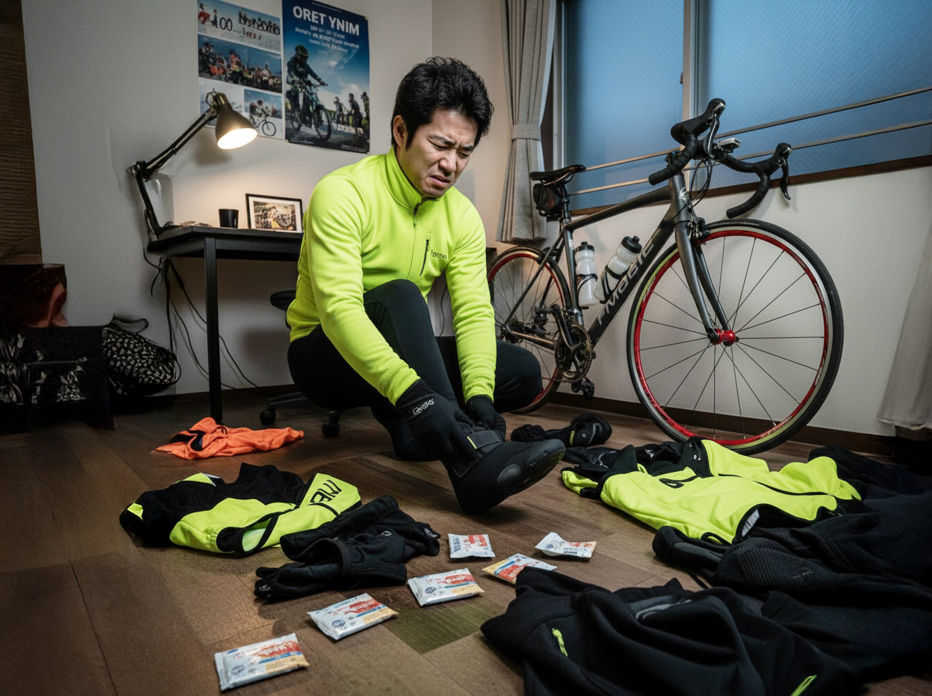 前のセクションで述べた通り、冬のライドは「完璧な装備」が大前提となる。しかし、その完璧さの追求こそが、我々ローディーを絶望の淵に突き落とす。なぜなら、夏場にTシャツ一枚で済んでいた装備が、冬になるとまるで軍の行軍装備のように増殖するからだ。